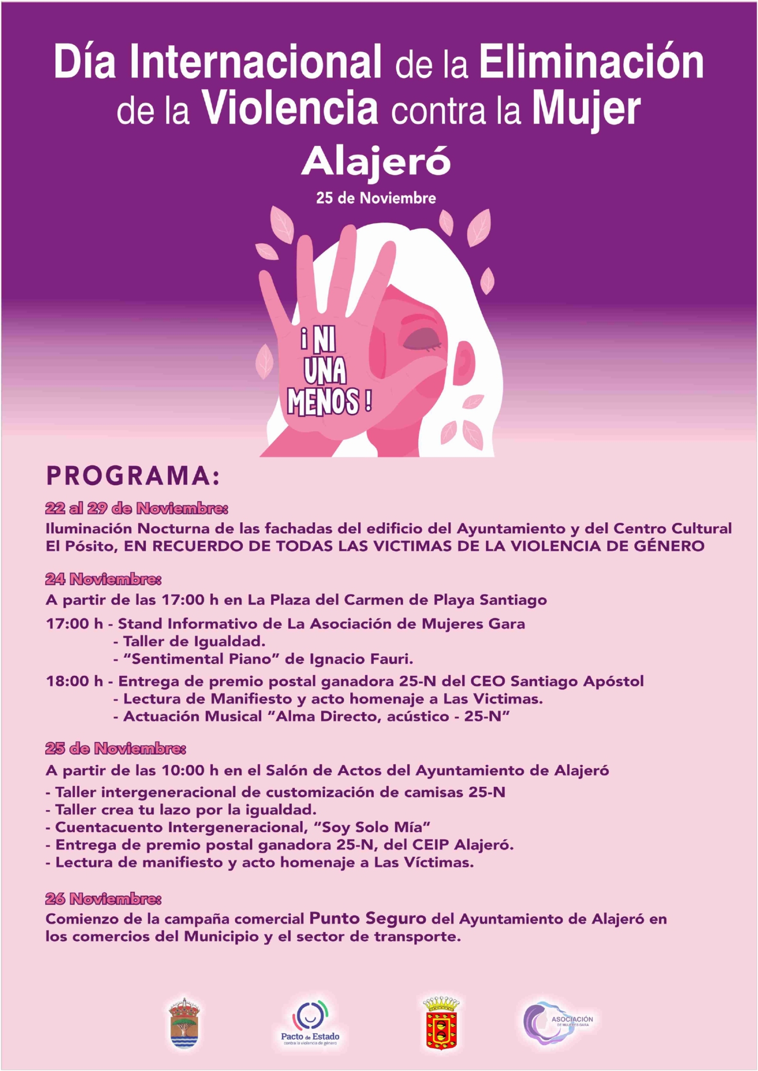 Alajeró se mobilise contre la violence à l’égard des femmes du 22 au 26 novembre avec des ateliers, lectures, musique, et illuminations, en collaboration avec l’Asociación de Mujeres Gara.